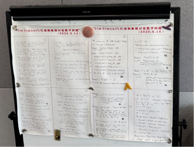 在茂源量化的办公室,挂着一幅“量化投资之父”詹姆斯·西蒙斯与丘成桐教授讨论数学问题的手稿,时间是2020年9月14日。郭学文告诉记者,这份手稿是由丘成桐教授赠送,当时已经82岁高龄的西蒙斯,在听丘先生讲座时与其讨论数学问题,依然认真地手写下了密密麻麻的问题,这种终身学习的态度让人触动不已。“每次看到这份手稿,都会感受到被激励。”